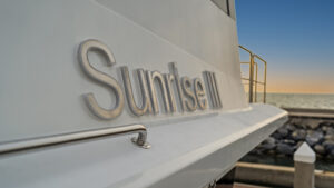 Sunrise III is the second hull of the Longreach’s to launch and this Expedition version incorporates a truly unique layout. The closed in cockpit features electric windows to easily open or close up the space, with a BBQ grill and cockpit L shaped lounge with an aft door that slides open and provides access to the Davco aft dinghy platform.