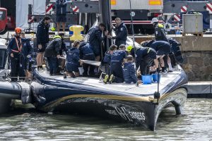 The morning was not without drama for the French team however, who suffered a nosedive during practice and were forced to return to their base to repair unspecified structural damage. A sterling effort ensued by the Shore Team and with minutes to go before a scheduled start against INEOS Britannia, the AC75 was fast-towed to the racecourse. The wind Gods played in their favour however, and the subsequent delays allowed them to get race-prepared but the ultimate cancellation of today’s racing will give the shore team more time to repair any damage incurred.