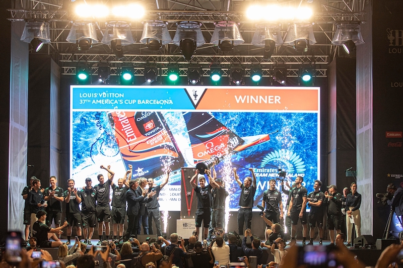 Bernard Arnault, the Chairman and CEO of Louis Vuitton Moët Hennessy, and Pietro Beccari, Chairman and CEO of Louis Vuitton were welcomed aboard the winning yacht Taihoro by the Kiwi sailors before the customary spraying of Moët & Chandon champagne in celebration. Later that evening the trophy was presented on the main stage in Port Vell under the lights and amidst a blizzard of confetti. It was a fitting finale. Emirates Team New Zealand had completed the ‘three peat’ becoming the first single team to win three consecutive America’s Cup Matches.