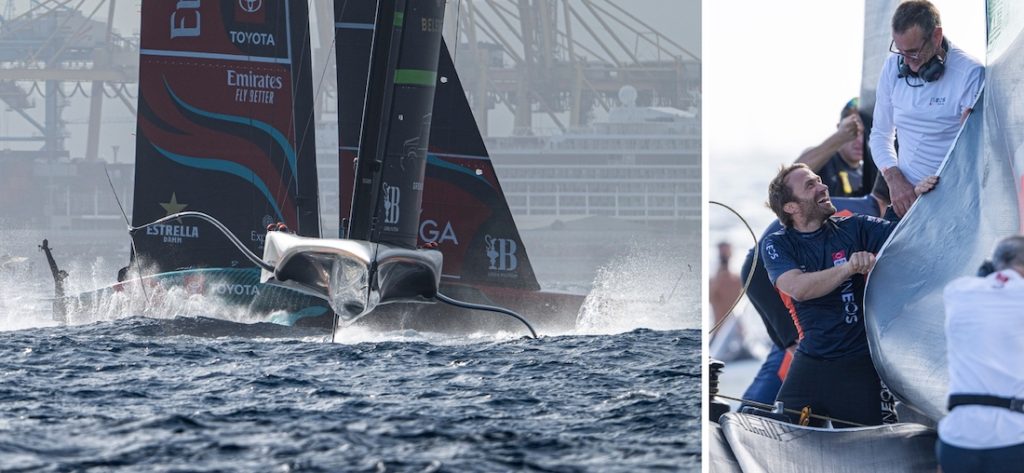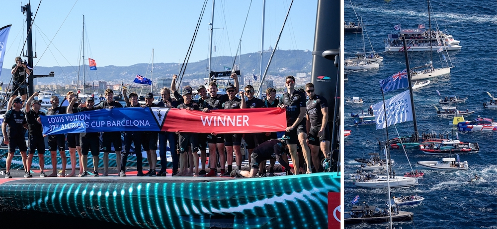A historical day for Emirates Team New Zealand, and a celebration for Barcelona. Photos: Ricardo Pinto (left) & Ian Roman (right), America’s Cup