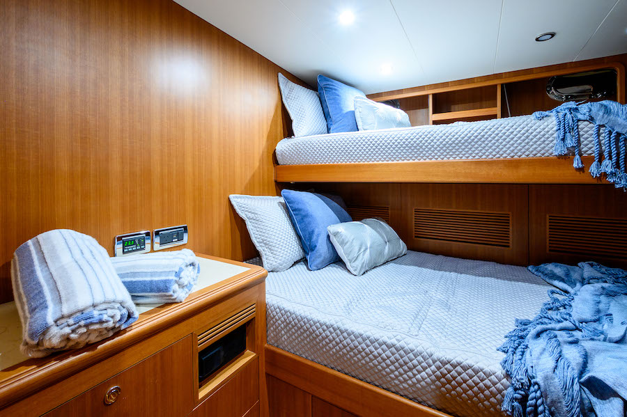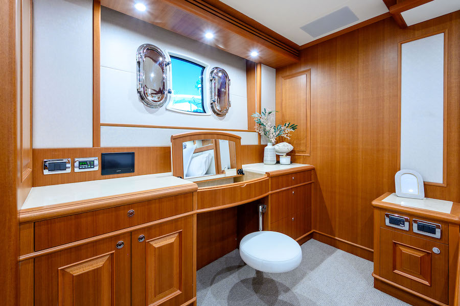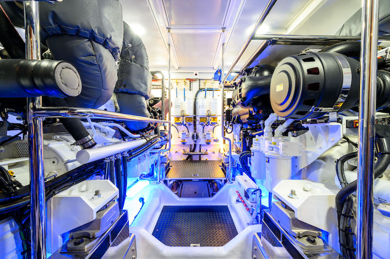 Powered by twin 1136hp CAT diesels on straight shafts with Veem propellers, the E680 cruises effortlessly at 10 knots and reaches over 21 knots when required. With an 8,000-litre fuel capacity, she delivers a range of 1,600 nautical miles, making her a genuine long-range cruiser.