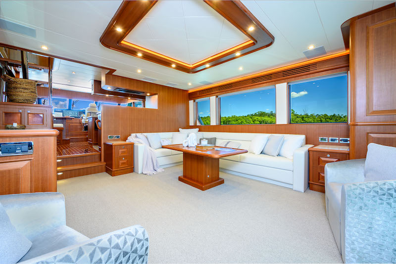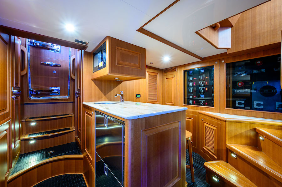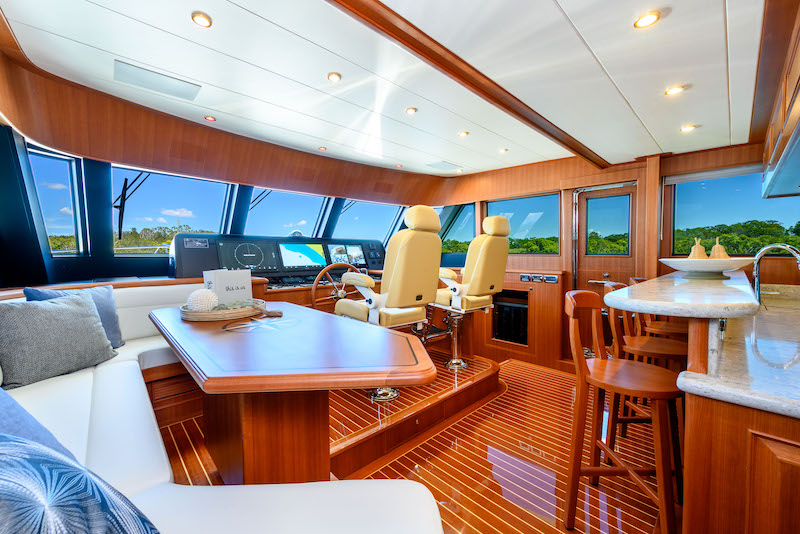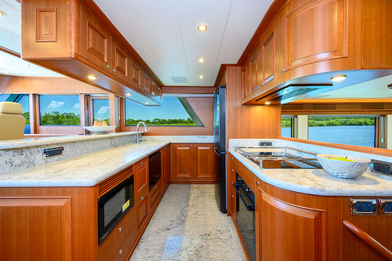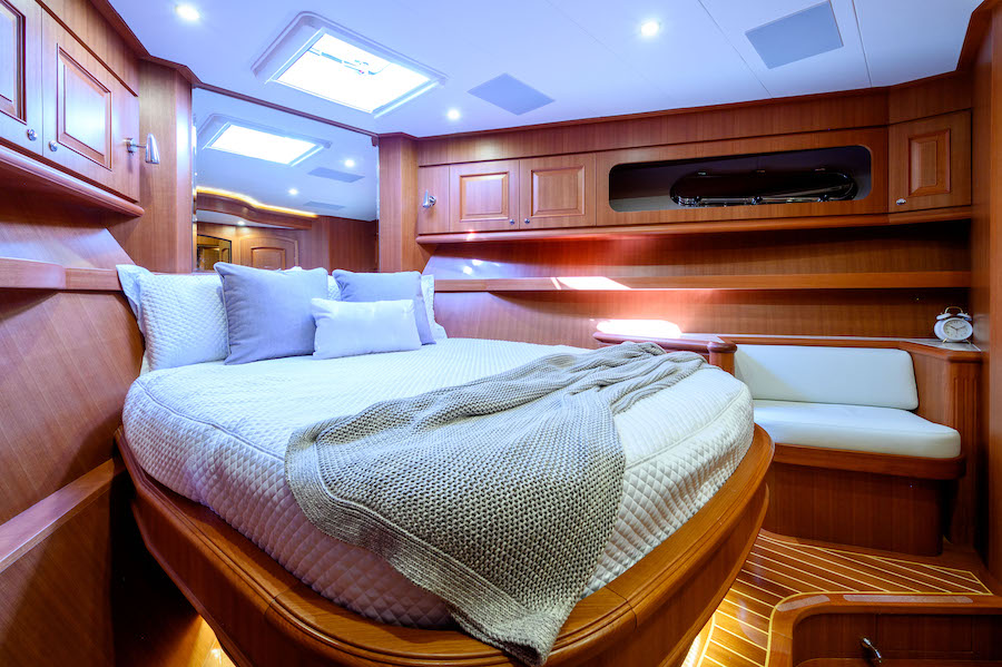 Along with its impressive design and décor, the Hampton 680’s standout feature is its innovative Split-Chine hull, from the pen of renowned naval architect Howard Apollonio. Constructed with Kevlar reinforcement and resin infusion, the hull offers outstanding strength, stability, and efficiency. Its fine entry and flared bow reduce drag while improving handling and onboard comfort in any sea state.