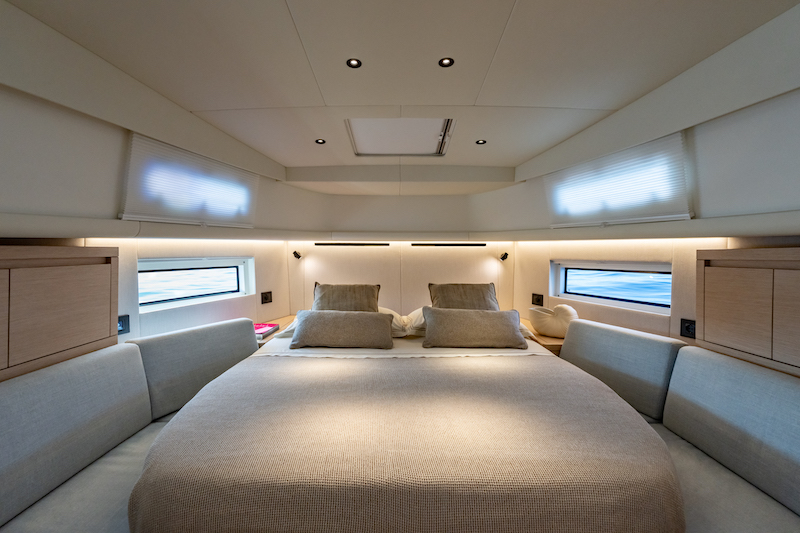 Below deck, interiors by Nauta Design deliver more light, more comfort, and more flexibility. Enlarged hull windows flood the cabins with natural light, creating a connection to the sea. Two layout options include either a fixed master berth or a convertible dinette, while the second cabin midships provides twin beds that can be enclosed for privacy. Premium fabrics, soft linings, and refined timber finishes elevate the atmosphere, while the enlarged bathroom with separate shower adds practicality for longer stays. Every detail has been carefully considered, making the new Pardo 43 feel like a private retreat.