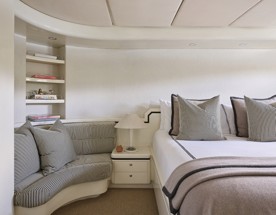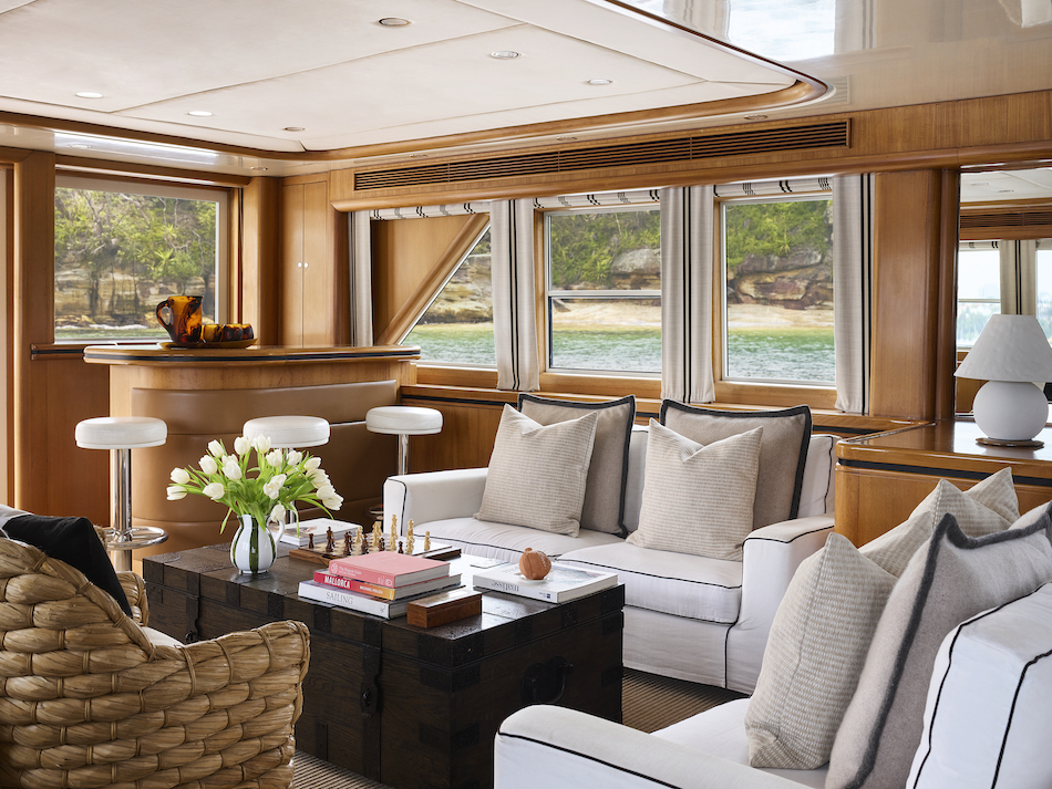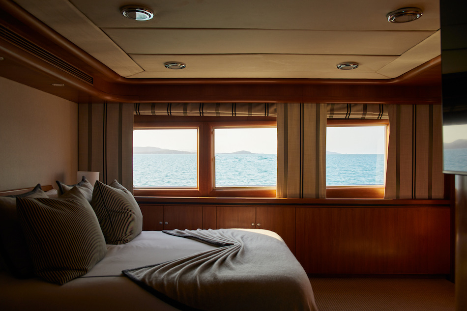 Designed by Tamsin Johnson, Sea Raes’ interiors extend the elegant yet relaxed Mediterranean aesthetic of Raes on Wategos. Accommodating up to eight guests overnight, the yacht features a master cabin, VIP cabin, and two twin cabins – each with its own ensuite – complemented by soft coastal tones, marble finishes, and vintage-inspired details that evoke the timeless charm of a classic yacht.