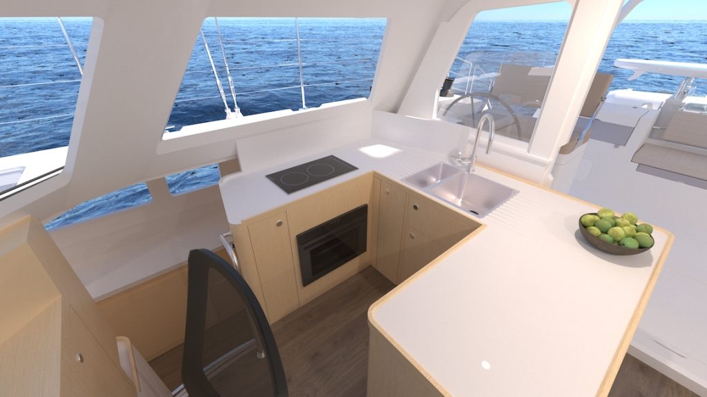 Seawind offers three distinct configurations. The traditional three-cabin galley-down layout provides arguably the largest galley of any serious cruiser in this class. But the real headline? For the first time on a Seawind of this size, a galley-up configuration is available in both three-cabin and four-cabin versions. The galley-up features a full U-shaped layout where crew can brace themselves in rough weather, plus a dedicated forward-facing nav station inspired by the larger Seawind 1370.