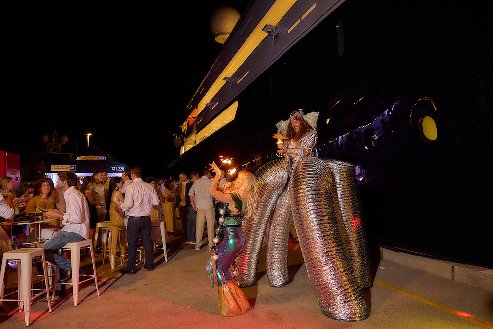 The atmosphere was set on entry with Troy on saxophone and Drew Boy keeping guests dancing dockside beneath the glow of superyachts, stilt walkers and a silver Mustang.