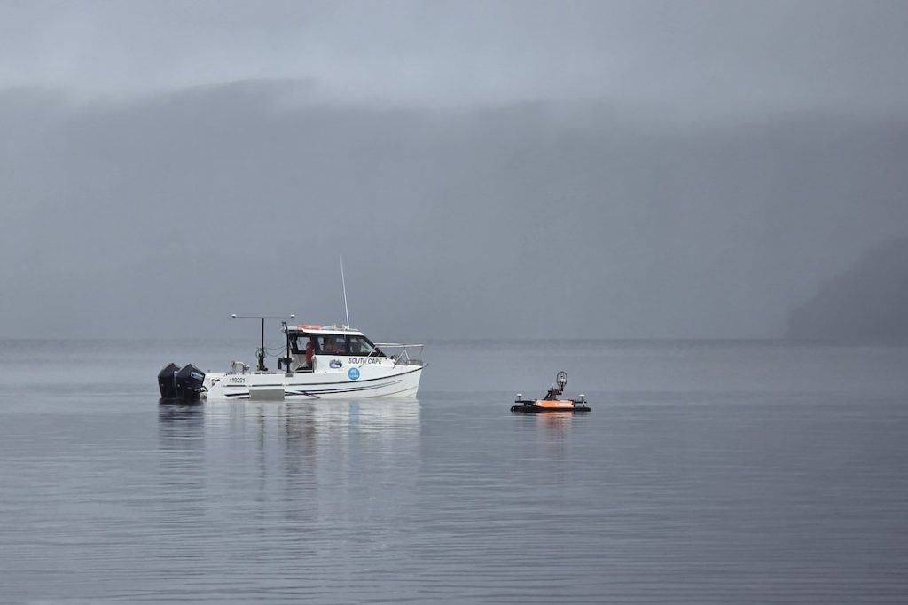 CSIRO’s RV South Cape works in tandem with the Otter uncrewed surface vessel on Lake St Clair, conducting environmental surveying in Tasmania’s remote wilderness. Image: CSIRO-Andrew Filisetti.