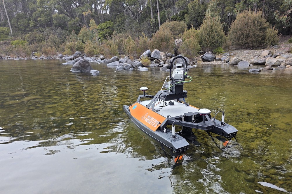 The Otter, an uncrewed surface vessel, conducting shallow-water surveys at Lake St Clair to support environmental monitoring and research. Image: CSIRO-Andrew Filisetti.