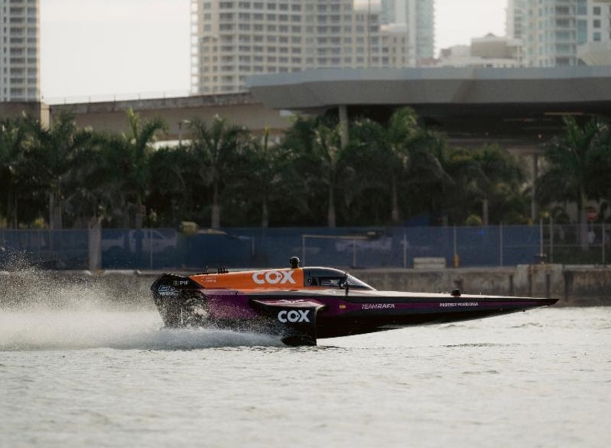 Team Rafa, piloted by Cris Lazarraga, 2019 European Jet Ski Racing Champion, and Tom Chiappe, an experienced powerboat racer, steered to the front of tomorrow’s grid on the waters of Biscayne Bay, Miami.