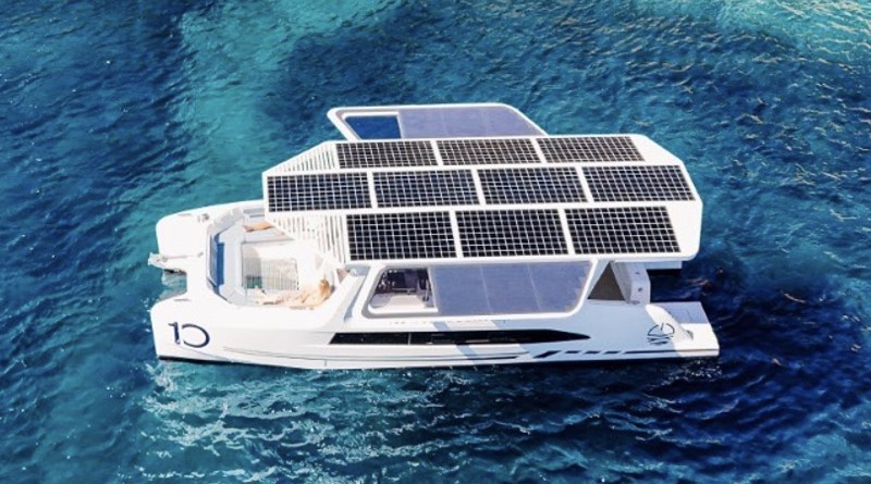 The M.10 is an innovative solar-electric 10m catamaran, offering comfortable living for 6 people, 360-degree visibility thanks to its solar roof, and total respect for the marine environment. It combines silence, absence of vibrations, and freedom without the constraints of internal combustion engines.