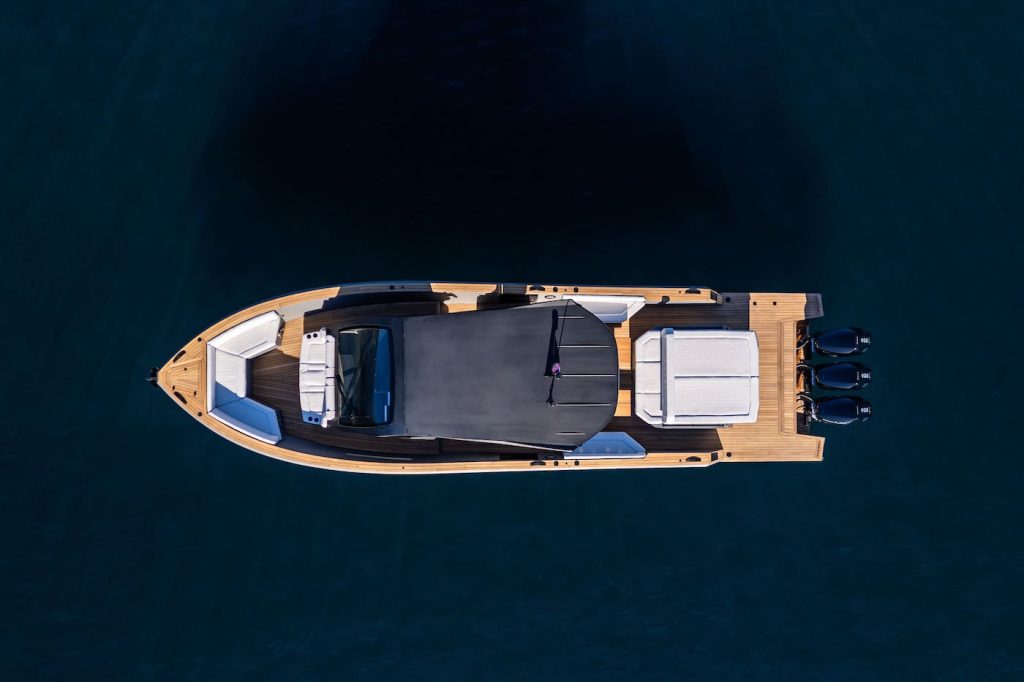 Maxim Yachts returns to the German boat show with the Max 44 R, a sporty daycruiser powered by three Yamaha engines of 450 horsepower each. The central outdoor area is designed as a versatile environment, featuring two foldable tables for a total of ten guests, four sofas, and 16 cup holders. The helm station includes a carbon-fiber steering console with four seats in addition to the pilot’s seat, and is equipped with two 16-inch Garmin displays and 11 analog gauges. The carbon-fiber hardtop is integrated with a JL audio system, including two speakers on the hardtop and six distributed around the boat. Both at the bow and stern there is a sunbathing area, while the aft zone offers generous storage space. The galley features a cooktop, a sink, and two large refrigerators, with the option to install up to four refrigerators and an ice maker. Below deck, the Max 44 R offers two double cabins, one of which can be converted into a lounge area.