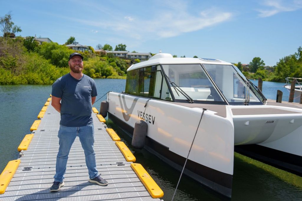 Vessev CEO Eric Laakmann next to a VS-9, an electric hydrofoiling catamaran, on Lake Taupo