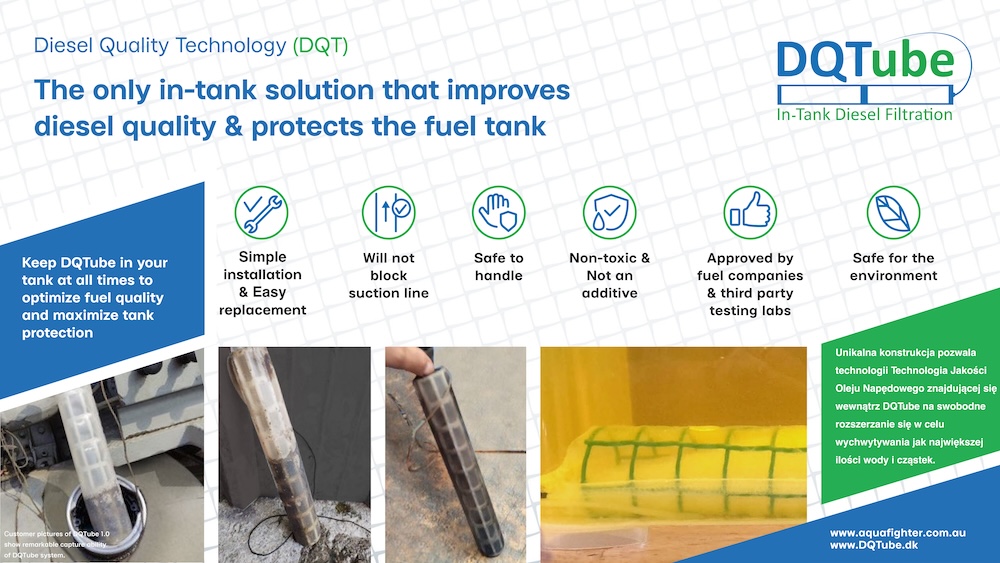 Aquafighter Australia, the distributor of DQTubes, says the product is designed to address the root cause: water and the contaminants that come with it. DQTubes are an in-tank diesel fuel filter solution intended to be left in the tank, where they can continually capture and isolate condensation and other contaminants over time.