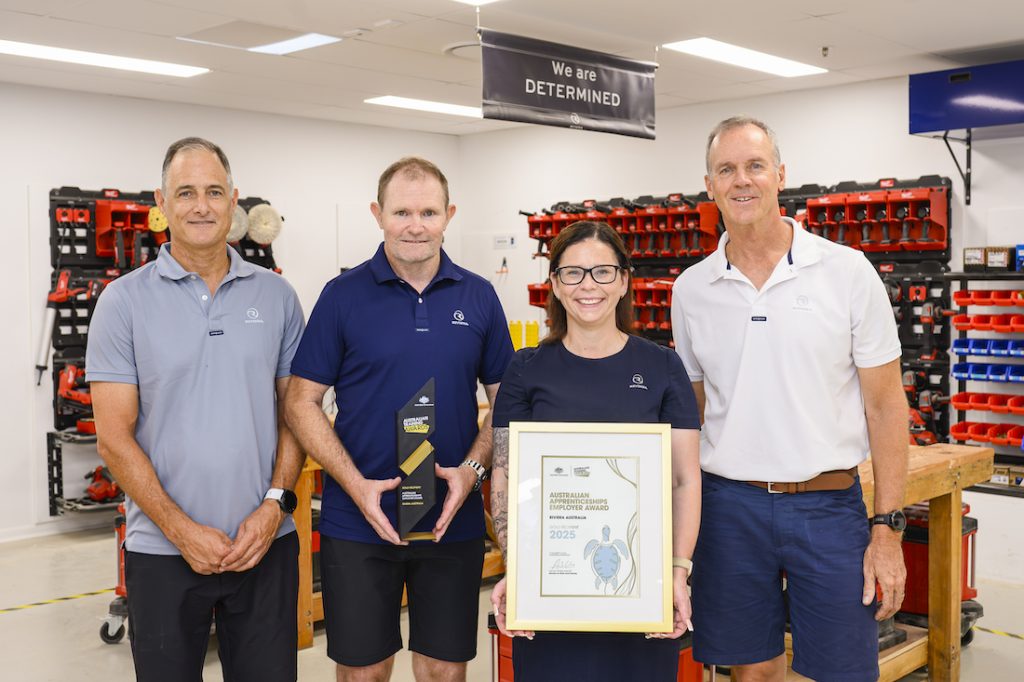 From the left: Justin Leigh-Smith and Darren Kearns – Riviera Academy of Excellence Instructors, Keira Badke – Riviera Apprentice and Training Manager and Rodney Longhurst proudly showcase the Australian Apprenticeships Employer Award.