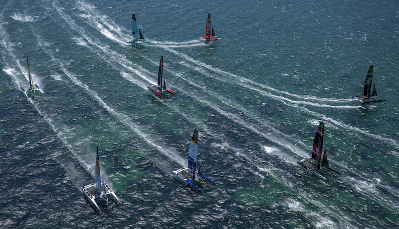 Day one saw twelve national teams hit the startline, equipped with the 24-meter all-purpose wingsail, high-speed rudders and titanium foils to navigate shifty, challenging conditions and 25 km/h breeze. Tomorrow, just 11 will line up after it was confirmed earlier in the week that Spain would not complete after sustaining significant damage in practice.