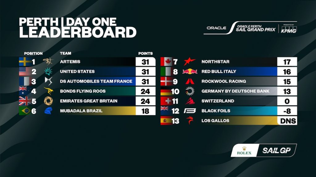 Artemis top the event leaderboard after a commanding performance that included two race wins – making clear there will be no learning curve for the 2026 debut. It was a standout day for the U.S. who trail the Swedish heading into day two, while DS Automobiles Team France round out the podium group in third. All three nations are tied on points – 31 each – going into Championship Sunday.