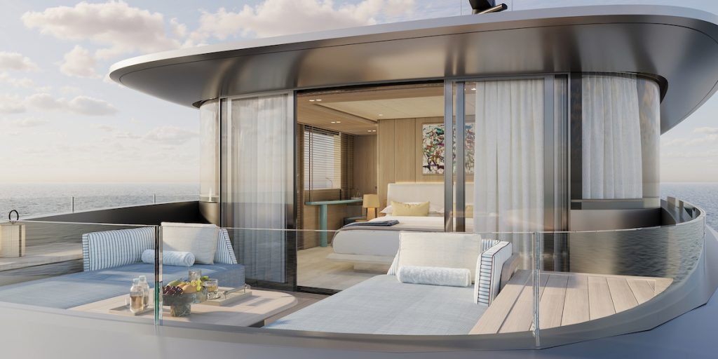The long, lazy aft pool area flows effortlessly into the Sea Atrium, a light-filled 2.4-metre high space enclosed by floor-to-ceiling glass walls. This seamless transition from sea to interior reimagines the beach club, transforming it into a social hub, a theme that continues throughout the interiors. The ultimate expression of this shared way of life is the Family Kitchen: an open, intimate space where family meals are shared just like at home ashore, making it the social heart of the yacht. The setting and open plan design means it doesn’t require the constant presence of crew – although the galley area can be separated with a sliding glass partition for more formal dining occasions.