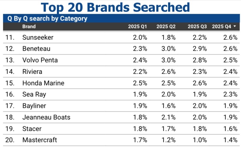 Honda Marine eased 7.7% from 2.6% to 2.4%, whilst Sea Ray climbed 21.1% from 1.9% to 2.3%, marking the brand’s strongest quarter of 2025 and sitting 0.4 percentage points above its Q1 baseline.