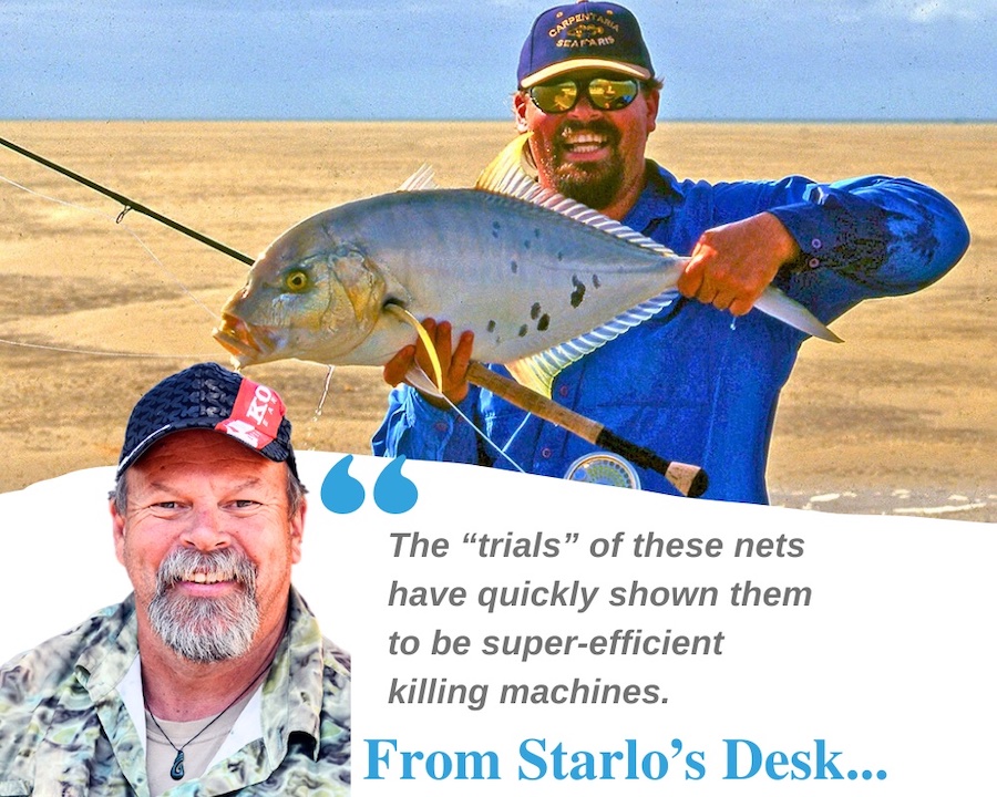 The “trials” alone of these nets reportedly caught 30,000 fish, representing 50 species. The average catch per set exceeded 1,800 fish weighing more than 770 kilos, but one shot caught over 6,000 fish. High on the list of species taken in big numbers during the trials have been iconic, keenly-sought sportfish such as golden trevally, permit (snub-nosed dart) and queenfish. These species have relatively low market prices, but are incredibly valuable to recreational anglers, who spend big dollars pursuing them and then typically release most of those they do land.