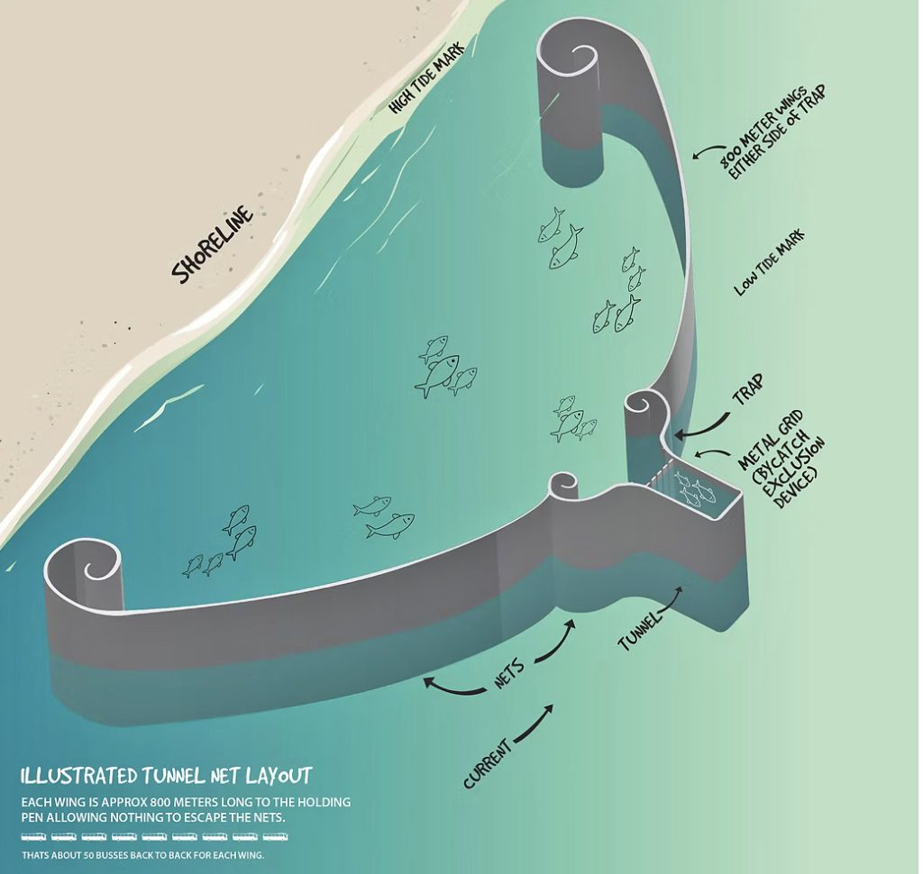 This is how tunnel nets work. Up to 1.6km wide, they funnel everything that swims into a central “killing cage”. (Image courtesy of The Inshore Flats Project)