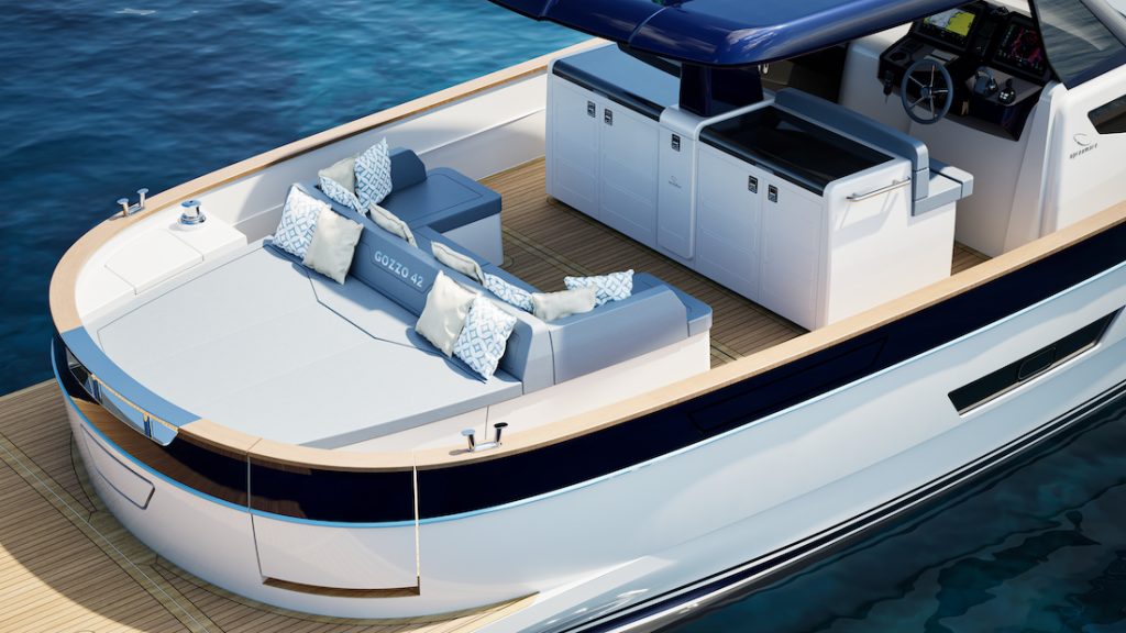 With a length overall of 12.80 metres and a maximum beam of 4.20 metres, the new Gozzo 42 is designed to accommodate up to 14 people on board, offering generous spaces and safe cruising even on challenging trips.