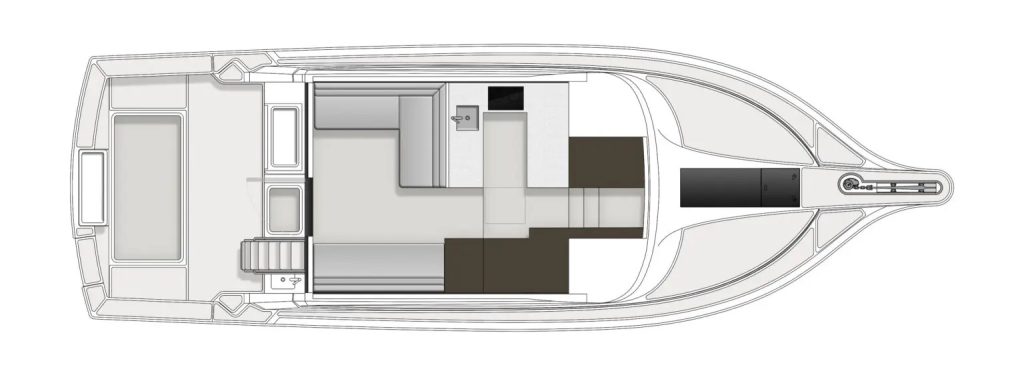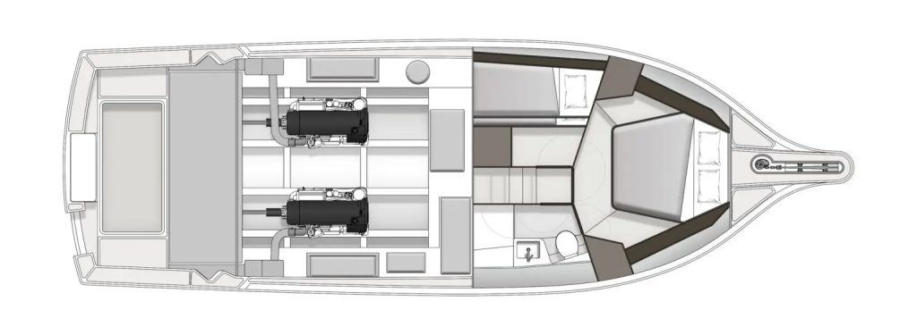 Standard power is a pair of Volvo-Penta D6 engines rated to 440hp, paired with ZF 85A gearboxes featuring a 2:1 reduction ratio. The standard drivetrain combination provides a balanced blend of torque, efficiency and range from the 2300 litres of fuel capacity. A higher output package will be available to enable owners to specify performance suited to extended coastal cruising, tournament fishing campaigns, or relaxed family passages. Reliability and serviceability remain central to the engineering brief.