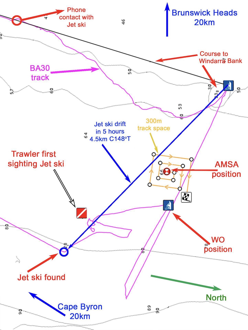 The rider had departed from Pottsville earlier in the day and travelled 18km offshore to Windarra Bank, a popular fishing ground located approximately 21km north-east of Cape Byron and 20km east of Brunswick Heads. After catching several snappers, he attempted to start his jet ski for the return journey, but a suspected electrical fault rendered the engine inoperable. With repeated attempts to restart the engine failing, the rider used his mobile phone to call his wife and friends around 4:00pm to seek assistance. The sun was setting quickly.