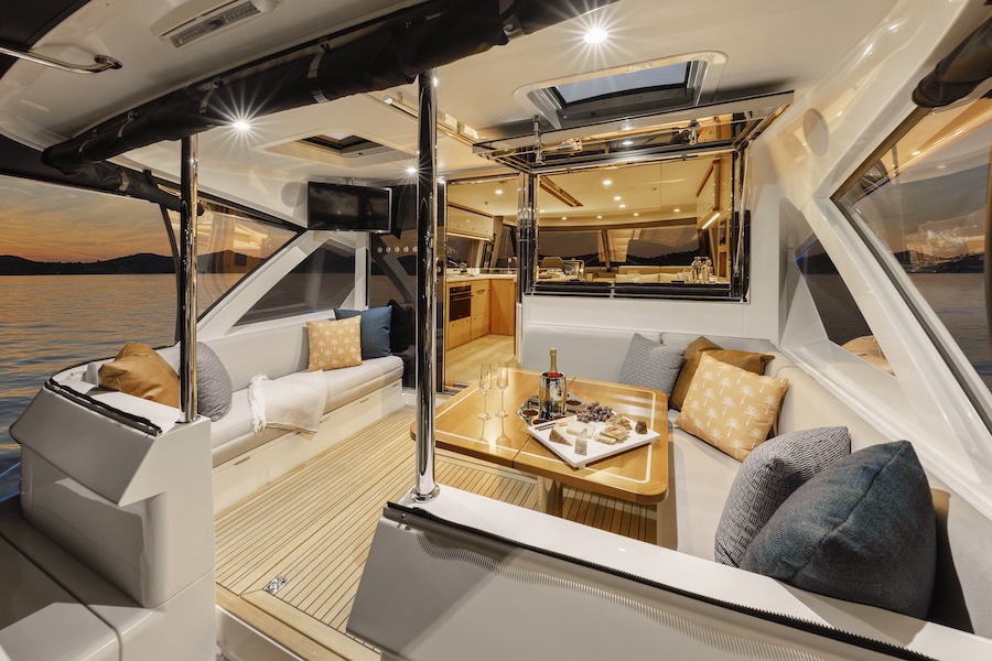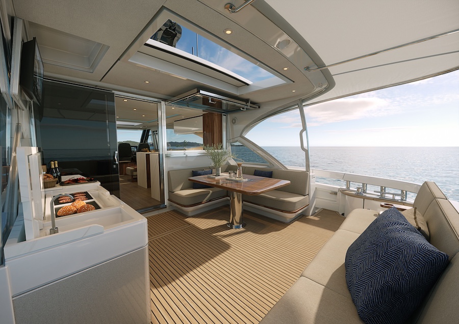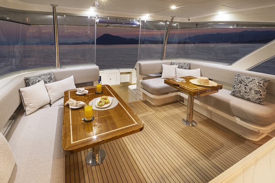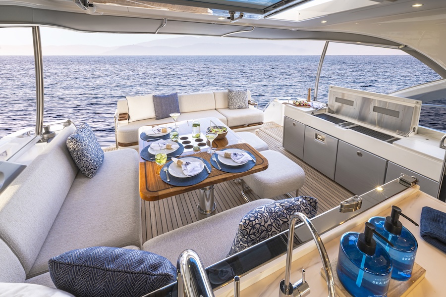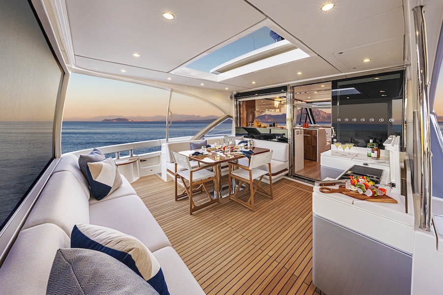 Designed for effortless entertaining, the expansive all-seasons aft deck features a dedicated alfresco galley and dining space, while the forward deck offers generous lounges and sunbeds for relaxed outdoor enjoyment.