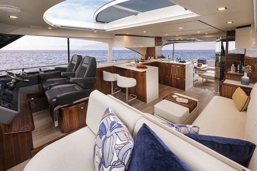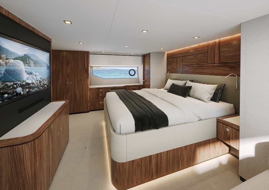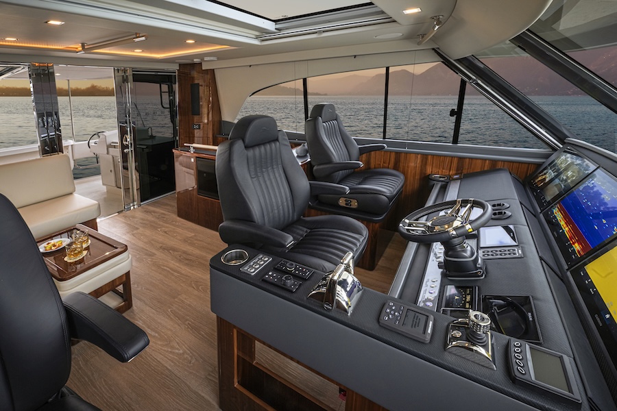 Below deck are three luxurious staterooms and two bathrooms, including a full-beam master suite with his-and-her cedar-lined lockers, plus a centrally located dedicated laundry.