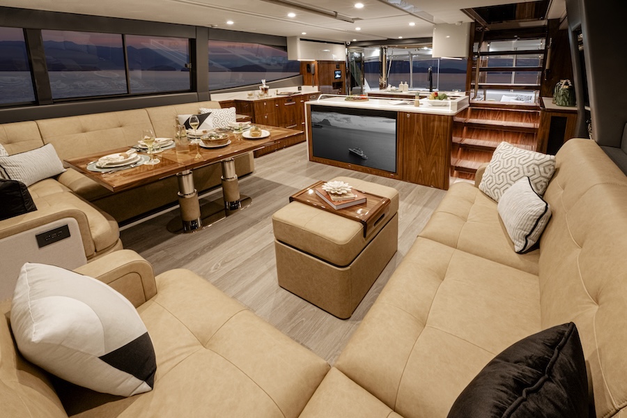 Inside, the saloon hosts a superbly equipped main galley with premium appliances and three luxurious lounges, including a forward dining setting with a fold-away table.