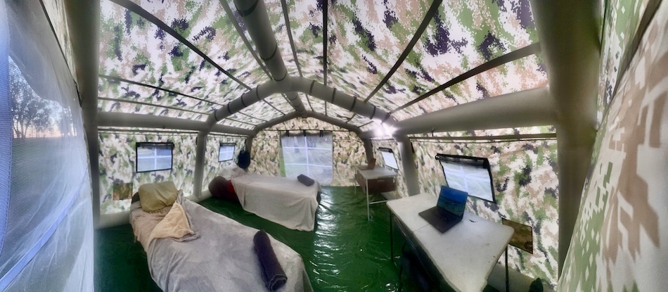 The Murrimbidgee Outdoors Australia inflatable tent is a mobile office, bedroom and dining room all in one.