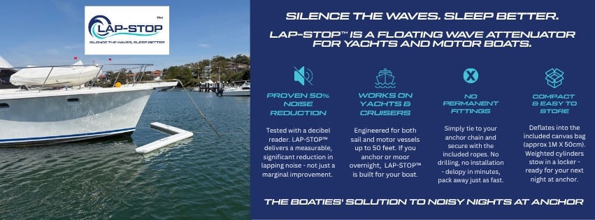 Lap-Stop is a floating wave attenuator designed for yachts and motorboats up to 50 feet, created to reduce the annoying lapping noise that can disturb a night onboard at anchor or on a mooring. Positioned at the bow, it works by flattening wind chop before it hits the hull, helping create a calmer zone around the front of the boat and improving comfort for those sleeping in the v-berth or forward cabin.